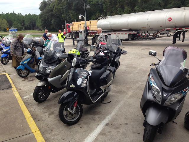 Going up, in Washington, Georgia, Rocket's belt began to slip. We stopped at a gas station along the highway, opened it up to see what we had. It turns out that the variator nut had backed off some and the splines in the outer drive pulley had stripped. This was preventing the variator from gripping the belt properly, making it slip. I had a spare outer drive pulley , but had left it at home. We were stuck. But Russ called George at Scooter Parts Co, and he had the parts and could get them to UPS for delivery to me the next day before 10:00. He came through as the parts arrived at 9:45. Rocket was all set for installation, that I did immediately at the gas station, where we had left Rocket overnight. And it ran great right away.