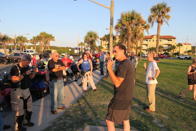 The 40 mile ride from home to the start in Fernandina Beach started in darkness with me a little uncomfortable, carrying an extra bag forcing me forward on the seat. It began getting light as I arrived at a parking lot filled with scooters. I was trying to get sorted with bags going into the support Rav4, then gas for the scooter and spare tank, when my brother David came to see me off. It wasn't a minute later when the scooter club arrived. I thought it would be Russ and Jim only, but it turned out to be many more. It was great support from such nice friends. I can't think of a better send off.